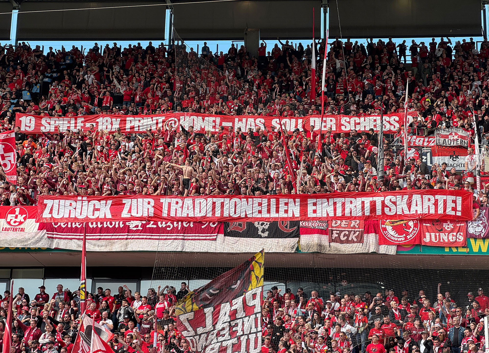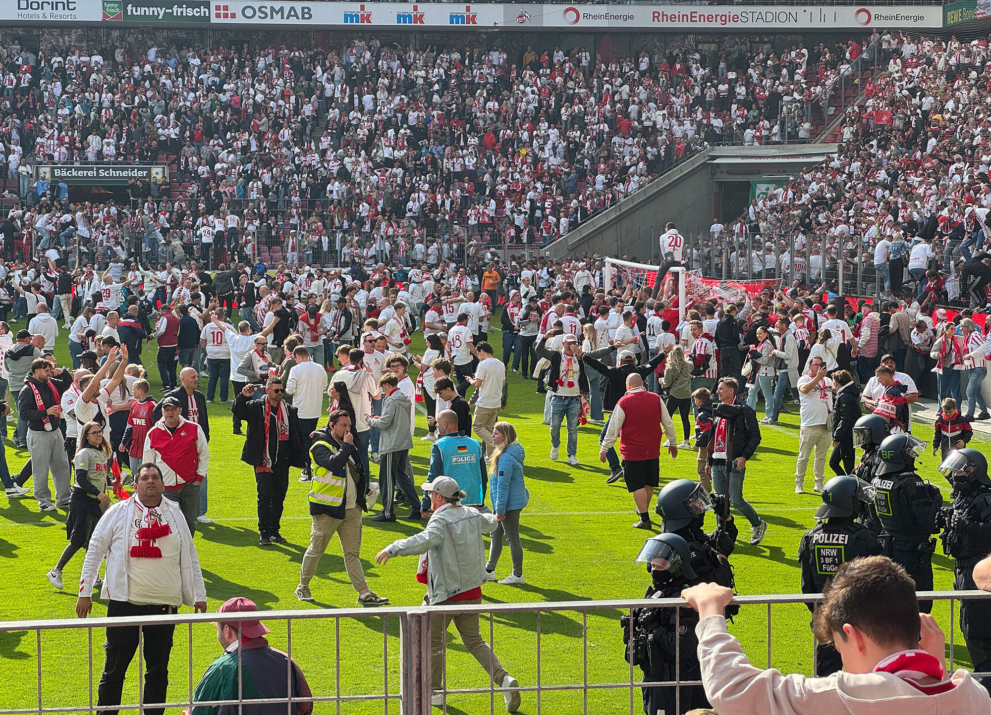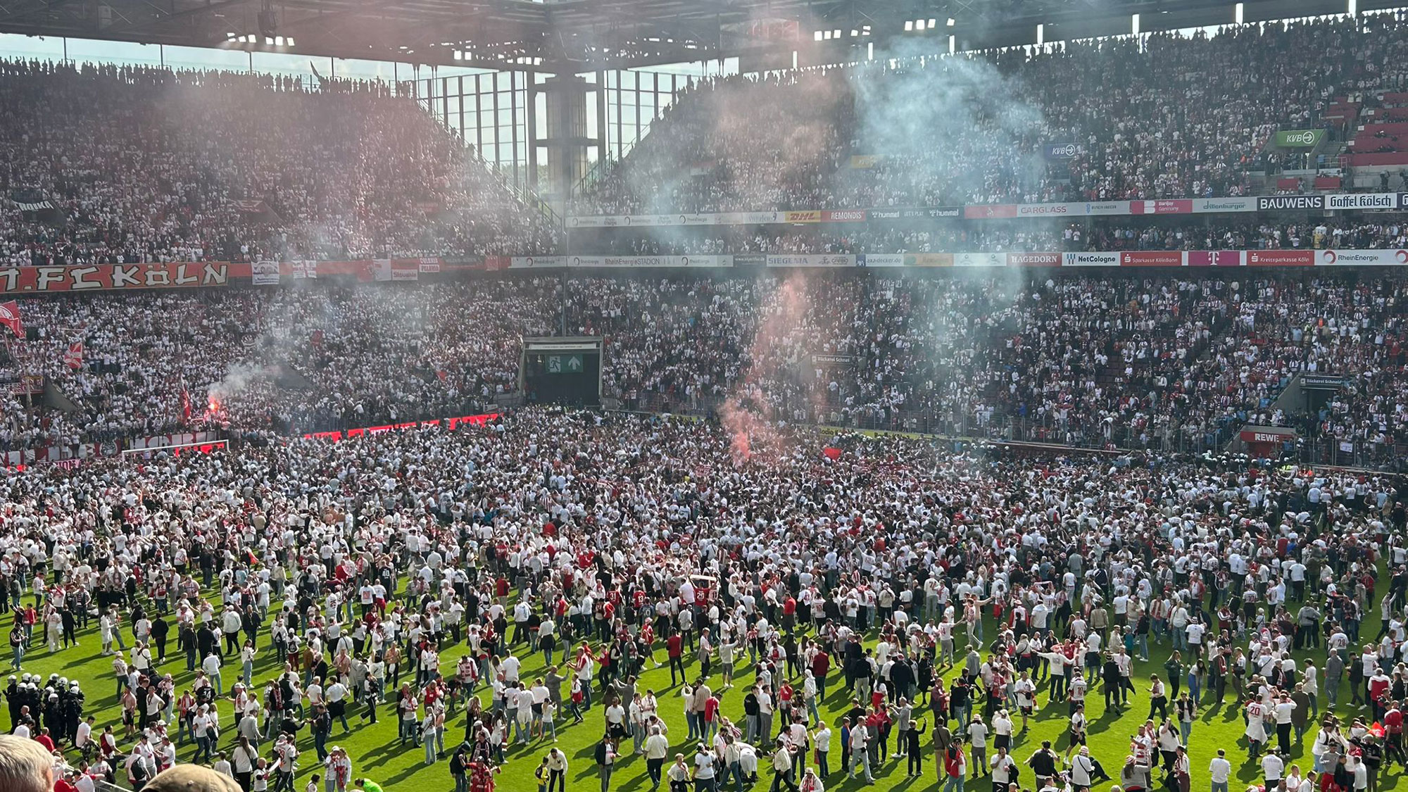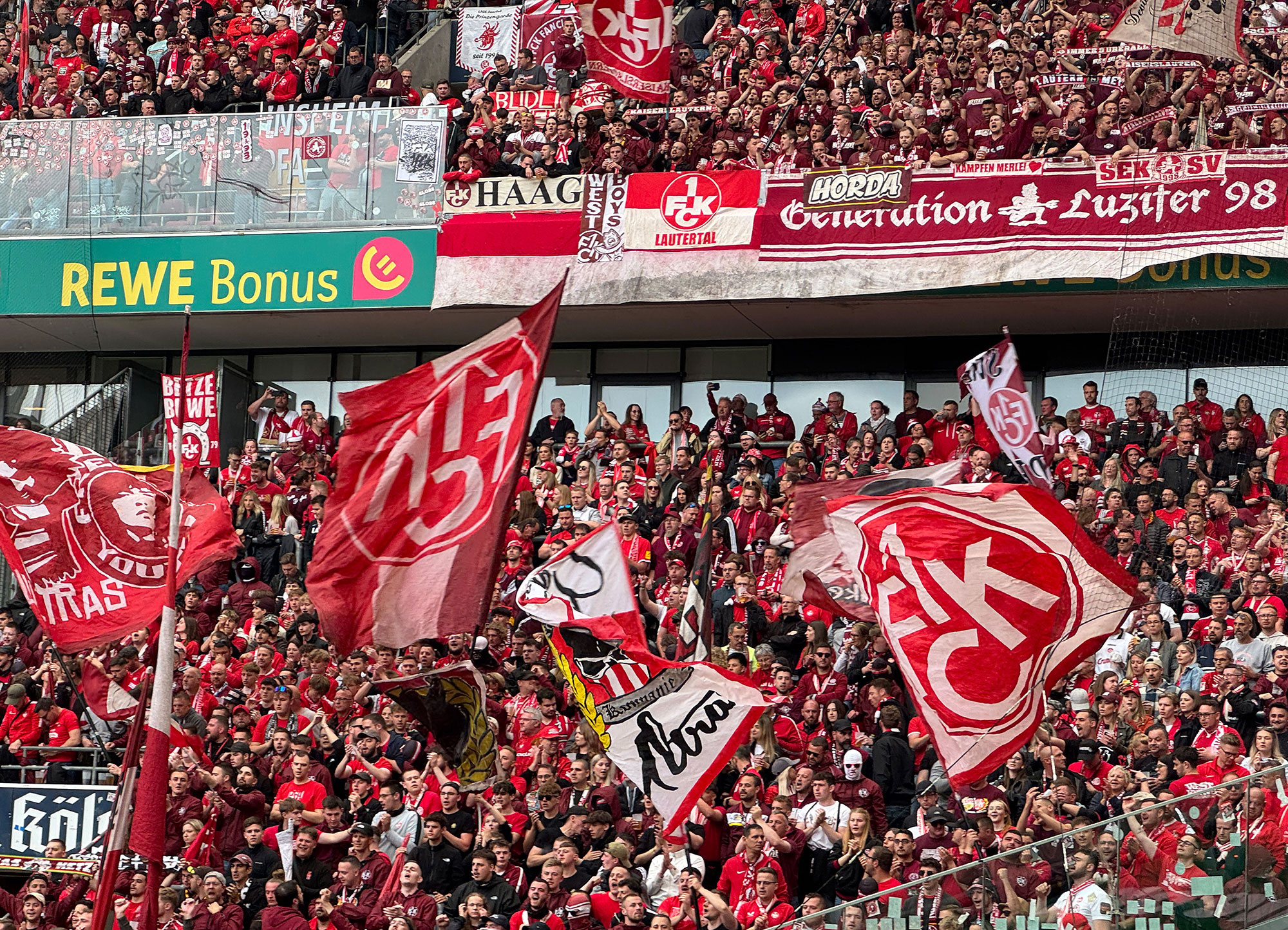 Wenn dieses Ziel von den Roten Teufeln auch verpasst wurde, erlebte die Fairplay-Reisegruppe dennoch im mit 50.000 Zuschauern restlos ausverkauften Stadion unvergessliche Momente. Die Kölner hätten für diese Begegnung gut und gerne über 300.000 Tickets verkaufen können. Auch beim FCK lagen mehr als 100.000 Anfragen vor! Und die Vorfreude wurde mehr als erfüllt! Die Atmosphäre im Kölner Stadion ist immer einzigartig, was vor allem auch durch die „Kölsche-Lieder" bedingt ist. Doch was rund um dieses Spiel in der „Rhein-Energie-Arena“ los war, sucht sogar in der Bundesliga ihres Gleichen. Vor dem Anpfiff feierten beide Fanlager ihr Team bombastisch, nach dem Schlusspfiff stürmten tausende Kölner Anhänger den Rasen und feierten den Aufstieg ihres Teams. Die Elf von „Zwei-Spiele-Trainer“ Friedhelm Funkel beendete die Saison sogar noch als Zweitliga-Meister!