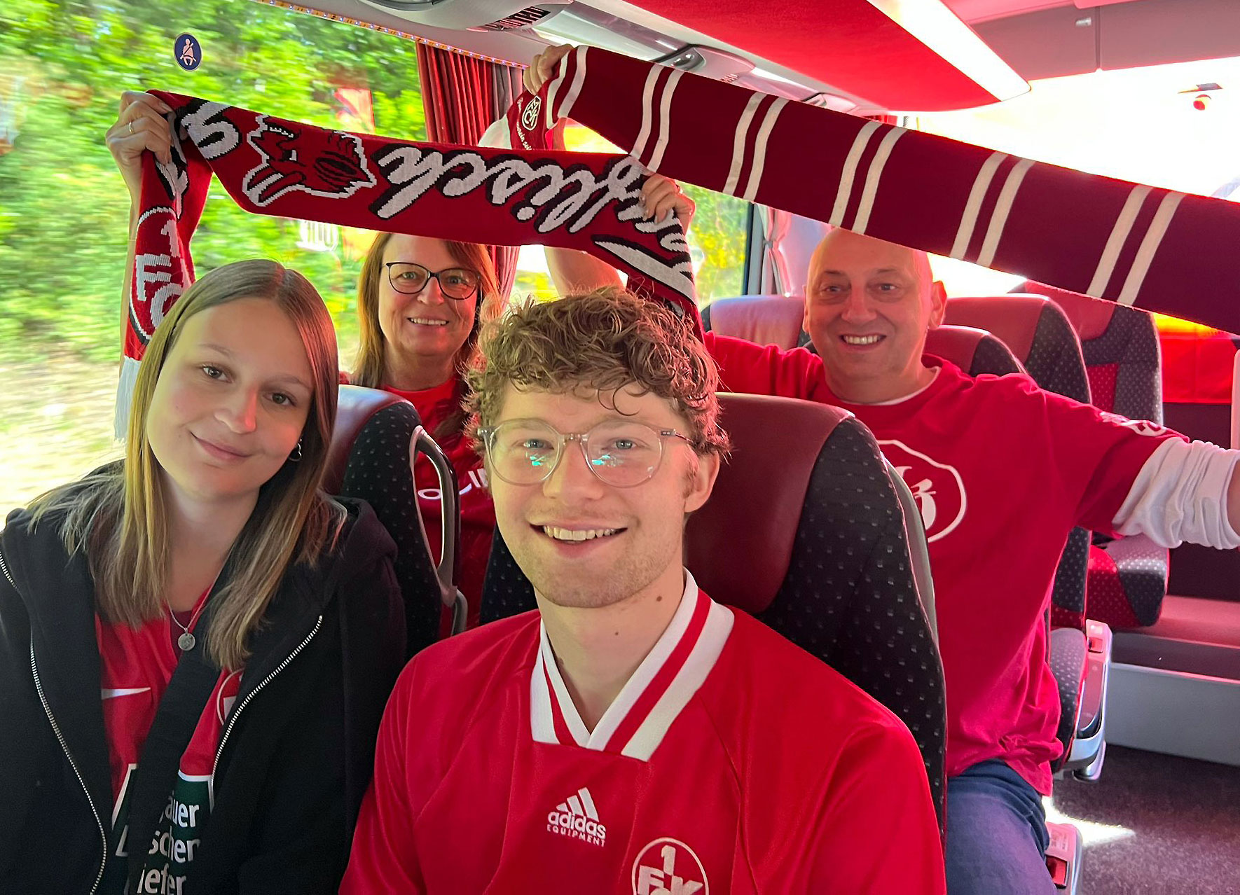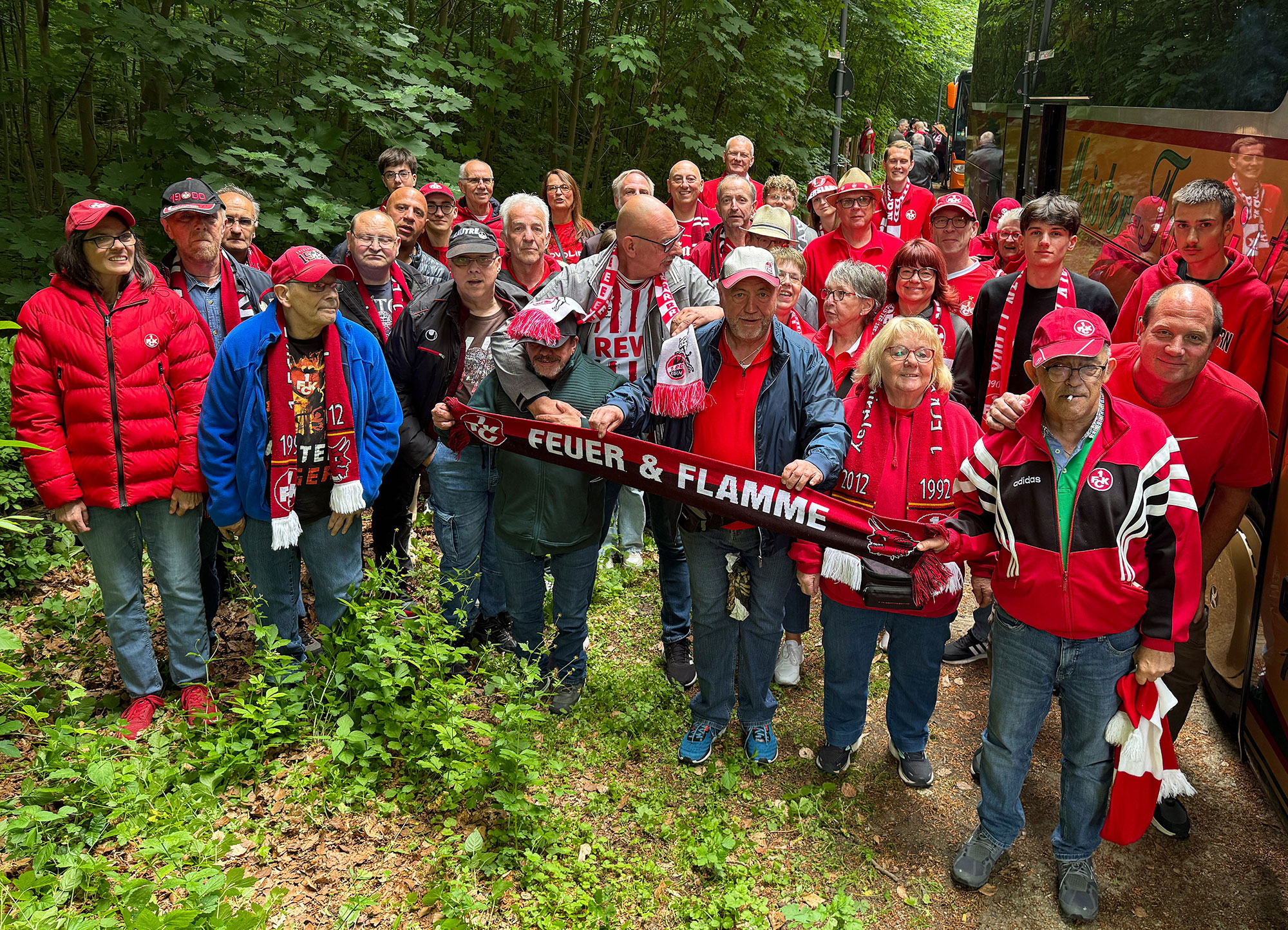 Daraufhin fanden sich am 18. Mai 2025 insgesamt 40 Fußballfreunde im Reisebus der Firma „Meister-Touristik“ ein. Darunter auch 9 Gäste mit Handicap aus den beiden Wohnheimen St. Martin und St. Elisabeth in Landstuhl. Deren Fahrtkosten sowie die Eintrittskarten finanzierte das Fanclub eigene „Rollstuhl-Sonderkonto“, welches jederzeit für Spenden offen ist.